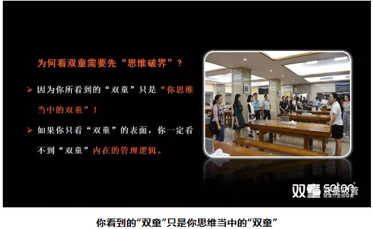 以“雙童”為例,很多人來“雙童”參觀都覺得“雙童”的硬件環(huán)境很好,但是每當(dāng)樓仲平和參觀者分享時(shí),他所做的第一件事就是引導(dǎo)大家進(jìn)行“思維破界”,突破你的眼前所見,去了解和探究“雙童’為什么要這么做,這樣做的底層邏輯在哪里,從而徹底理解“雙童”內(nèi)在的管理邏輯!