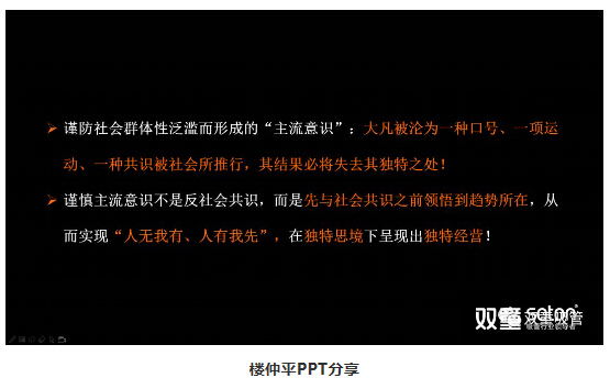 接著,樓仲平通過“稟賦效應(yīng)”的案例講述,讓大家理解到人一旦獲得就不愿意放棄,思想一旦陷入舊的傳統(tǒng)范式中,就極難轉(zhuǎn)換到新的思維范式中去。因此,創(chuàng)業(yè)者需要打破慣性思維、從眾思維、感性思維的“思維遮蔽”,突破“稟賦效應(yīng)”,脫離傳統(tǒng)群體保持思想獨(dú)立,從而實(shí)現(xiàn)認(rèn)知升維!