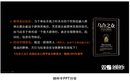 講到這里,樓仲平又向大家推薦了法國(guó)社會(huì)心理學(xué)家勒龐的著作《烏合之眾》,該書中提到了群體意識(shí)盲區(qū):當(dāng)個(gè)體處在孤立時(shí)具有的個(gè)性特征融入群體后都會(huì)被這個(gè)群體所淹沒,其思想會(huì)被群體思想所取代,而當(dāng)眾多個(gè)體形成一個(gè)龐大群體時(shí),就會(huì)呈現(xiàn)情緒化、趨同化、低智化等特征。