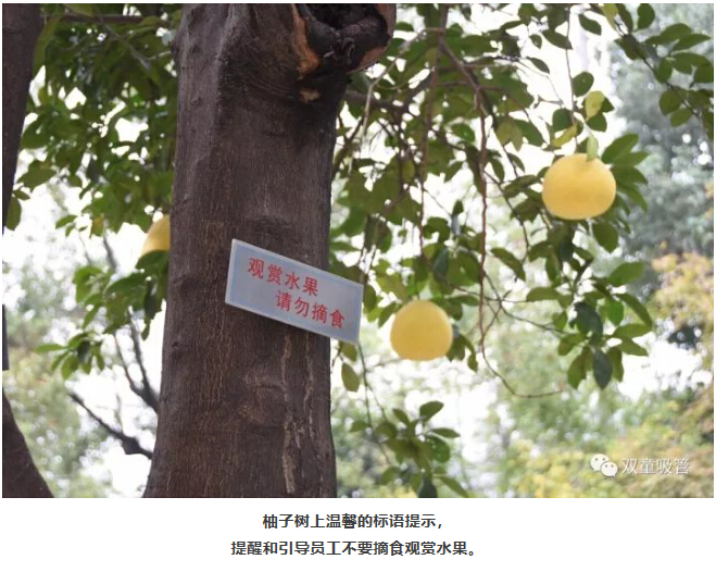 原來,為了“雙童”的生態(tài)和美觀,公司明確柚子是觀賞性水果,每棵柚子樹上都有“觀賞水果,請(qǐng)勿摘食”的字樣,提醒和引導(dǎo)員工不要摘食觀賞水果。