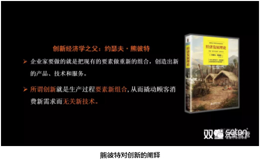 創(chuàng)新經(jīng)濟(jì)學(xué)之父約瑟夫·熊彼特,曾在其著作《經(jīng)濟(jì)發(fā)展理論》中對“創(chuàng)新”做了重新定義:所謂創(chuàng)新就是生產(chǎn)過程中的要素新組合,從而撬動(dòng)顧客消費(fèi)新需求而無關(guān)新技術(shù)。企業(yè)家要做的就是把現(xiàn)有的要素做重新的組合,創(chuàng)造出新的產(chǎn)品、技術(shù)和服務(wù)。其本質(zhì)就是所謂的創(chuàng)新。