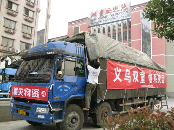 5.12汶川大地震,牽動(dòng)著義烏人民的心尖,抗震救災(zāi),義不容辭。2008年5月30日,在得知綿陽(yáng)災(zāi)區(qū)急需生活用品的消息后,第一時(shí)間內(nèi)由9家生產(chǎn)日用品的義烏企業(yè)主自發(fā)組織了賑災(zāi)活動(dòng),其中義烏市雙童日用品有限公司、義烏市佳潔塑膠有限公司、義烏市安柔為衛(wèi)生用品有限公司、浙江康泰塑業(yè)有限公司、義烏利津日用品有限公司、義烏圣象塑料制品有限公司、義烏市春香日用品廠、義烏市好易日用品有限公司、義烏市一帆日用品有限公司共計(jì)物資達(dá)136萬(wàn)元,包括塑料杯5100箱、大號(hào)垃圾桶1500箱、衛(wèi)生巾400箱、嬰兒尿褲400箱,由義烏梅湖體育館出發(fā),分10車直接發(fā)送四川災(zāi)區(qū)。