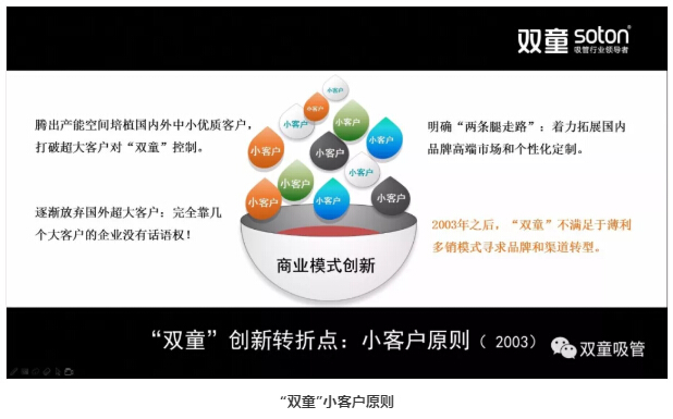于是,“雙童”逐步爭(zhēng)取到了大量原被忽視的小客戶群體,這樣一來(lái),使“雙童”有效地降低了部分客戶過(guò)于集中所帶來(lái)的企業(yè)風(fēng)險(xiǎn),從而牢牢掌握企業(yè)經(jīng)營(yíng)的主動(dòng)權(quán)!