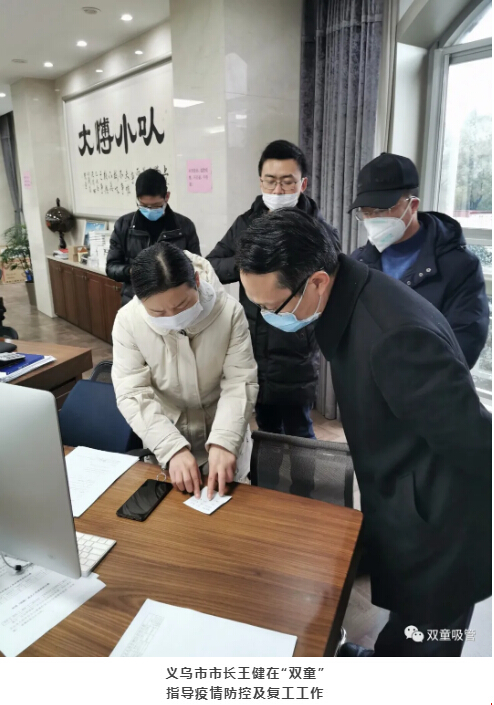 除了義烏市稅務(wù)局捐贈(zèng)的防疫物資外,在此次抗疫復(fù)工過(guò)程中,“雙童”深刻感受到義烏市政府對(duì)我們的支持和幫助。義烏市市長(zhǎng)王健、副市長(zhǎng)賈文紅也曾來(lái)到“雙童”指導(dǎo)疫情防控和復(fù)工工作,時(shí)刻關(guān)注“雙童”的復(fù)工發(fā)展。