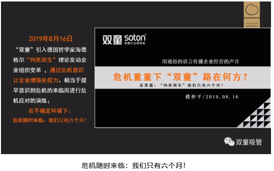 早在2019年8月16日,“雙童”再次推動企業(yè)重大改革,引入德國哲學(xué)家海德格爾的“向死而生”理論,讓團隊認知到雙童離“死亡”只有六個月,以此激發(fā)員工的危機感,讓企業(yè)增強免疫能力。這相當(dāng)于提早六個月讓員工們進行了危機應(yīng)對的演練,從而在不確定的環(huán)境下,讓所有組織成員意識到危機隨時可能來臨。