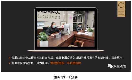 利用此次疫情危機,雙童樓仲平及李二橋充分利用“難得的安靜時光”,充分思考并完善組織變革,讓組織成員在此次危機的影響下得以完全轉(zhuǎn)變,推動雙童從“管理型組織--平臺型組織”轉(zhuǎn)變,盡最大努力將危險化解為機遇!