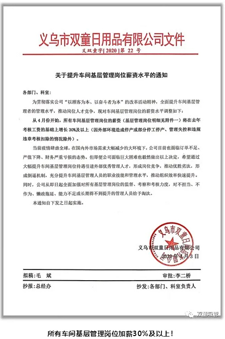 在危機(jī)裁員降薪風(fēng)潮盛行的當(dāng)下,恰恰是我們推動(dòng)組織變革的好時(shí)機(jī)。所以,“雙童”借力于這樣一個(gè)機(jī)會(huì),發(fā)布了加薪文件,給所有車間基礎(chǔ)管理崗位加薪30%及以上!也希望通過此舉引進(jìn)更多的優(yōu)秀管理人才,實(shí)現(xiàn)優(yōu)勝劣汰,從而激發(fā)組織中每個(gè)員工的積極性。
