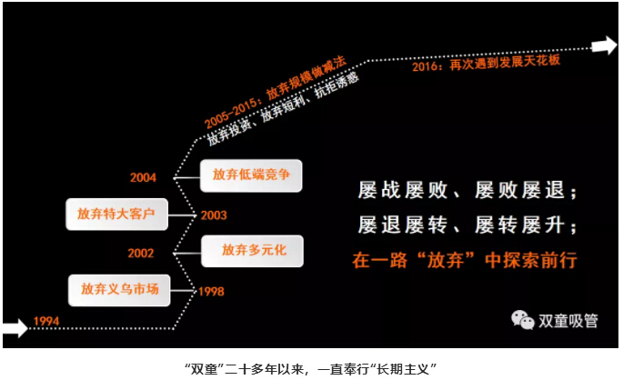 答:這些年來,‘’活下去”確實(shí)已經(jīng)成為“雙童”最大的使命。對(duì)我們而言,提出“活下去”這樣一種危機(jī)理論,是因?yàn)樵谕獠縿?dòng)蕩環(huán)境下,計(jì)劃沒有變化快,這就要求企業(yè)做出轉(zhuǎn)變,這種轉(zhuǎn)變是內(nèi)在的,其本質(zhì)是提醒組織成員,通過直面“死亡”,獲得反悟,讓自己重生。并且,我們所說的“活下去”,并不是茍且偷生,而是要有價(jià)值、有尊嚴(yán)地“活下去”,唯有如此,這樣的使命對(duì)“雙童”的長期發(fā)展才更有意義。