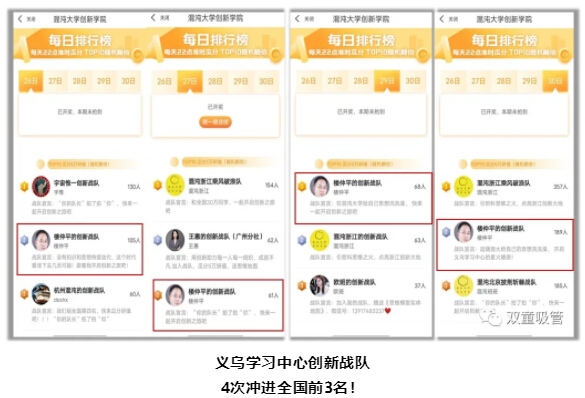 比賽進(jìn)行期間,義烏學(xué)習(xí)中心的小伙伴們絞盡腦汁、竭盡全力,讓義烏中心創(chuàng)新戰(zhàn)隊(duì)的成員陣容不斷擴(kuò)大,從而在幾百個(gè)創(chuàng)新戰(zhàn)隊(duì)中脫穎而出,創(chuàng)下了連續(xù)4天進(jìn)階全國前3名的好成績!