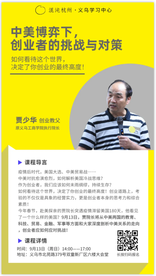 9月13日(周日)14:00~17:00,“創(chuàng)業(yè)教父”賈少華將在混沌大學義烏學習中心,從中美兩國的教育、科技、貿(mào)易、金融、軍事等方面和大家深度剖析中美關(guān)系的走向,創(chuàng)業(yè)者應如何應對挑戰(zhàn)!