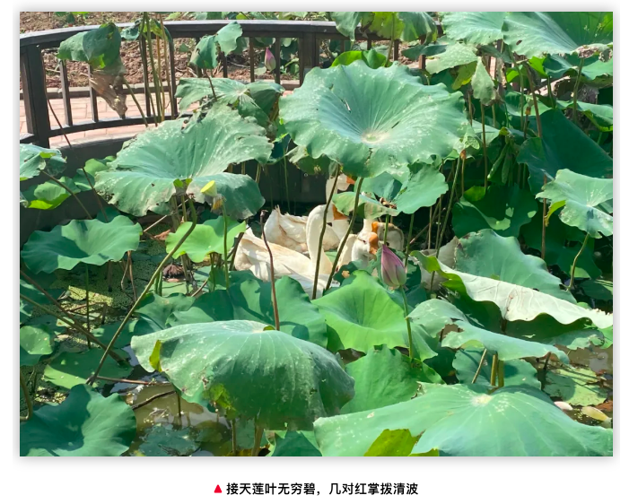 100多平米的“空中藕塘”里,有荷花迎風(fēng)招展,蓮蓬低垂悄立,翠綠的荷葉撐起爿爿蔭蔽,小魚(yú)和大鵝們悠游其間。