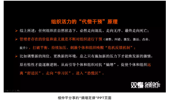 而避免“熵增”的唯一方法就是管理者持續(xù)開放和組織干預(yù),從而打破平衡,持續(xù)加壓、刺激個(gè)體和組織喚醒“危機(jī)反饋機(jī)制”,從而讓個(gè)體和組織遠(yuǎn)離“舒適區(qū)”,走向“學(xué)習(xí)區(qū)”,進(jìn)入“恐慌區(qū)”,原有惰性才能逐漸逆轉(zhuǎn),從而煥發(fā)出新的活力!