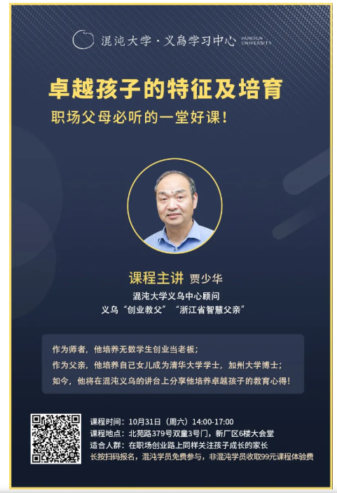 10月31日下午,我們將邀請“混沌大學(xué)義烏中心顧問”賈少華院長,為混沌義烏的同學(xué)們獻上一堂“創(chuàng)業(yè)者子女教育”的饕餮知識盛宴——《卓越孩子的特征及培養(yǎng):家庭教育的實踐和藝術(shù)》專題講座,從切身經(jīng)驗出發(fā),分享自己培育孩子成為清華大學(xué)學(xué)士、美國加州大學(xué)博士的家庭教育心得。