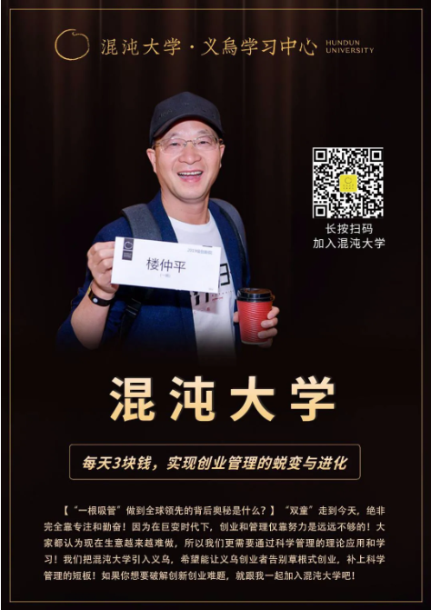 今年八月,樓仲平將“混沌大學”引進義烏,就是想把上百堂讓他自己和“雙童”持續(xù)受益、不斷有新的進步的課程,分享給每一位愛學習有夢想,想在新時代里勇立潮頭的創(chuàng)業(yè)者們!