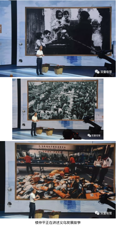在節(jié)目現(xiàn)場,“雙童”樓仲平也帶來了許多精彩的照片。其中,開場照片便是義烏這座城市的對比照片。通過挑貨郎與義烏小商品城開展全球電商的照片對比,樓仲平講述了義烏如何從貧瘠落后的小縣城發(fā)展為全球最大的小商品集散中心的故事……