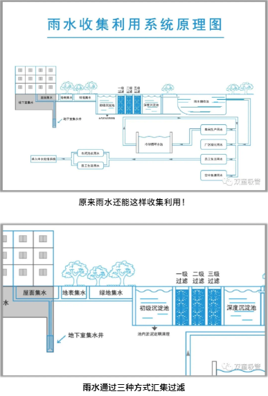 秘訣就是在屋頂、路面、綠化帶中做好雨水收集點,用地下管道把它們連成一個整體,經(jīng)過科學(xué)過濾,匯集到一個總裝水容量2000多噸的雨水收集池。