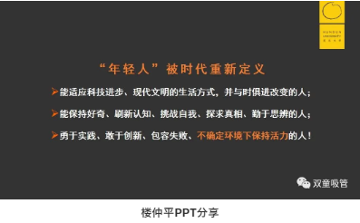 他認(rèn)為:“年輕人”是這個(gè)時(shí)代的主人。他們更能接受新的變化,更能理解新鮮事物,更能獲得新的機(jī)遇。50后、60后、70后們只能更努力地向年輕人靠攏,向年輕人學(xué)習(xí),才不會(huì)被這個(gè)時(shí)代所拋棄,才能在不確定的時(shí)代下保持活力!
