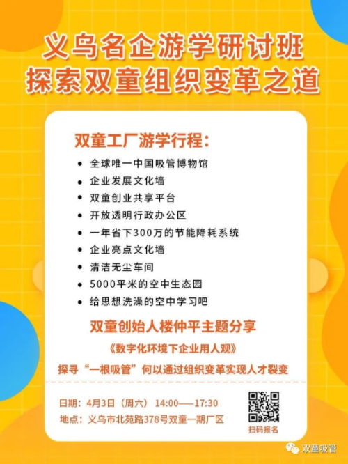 “雙童”二期新廠房 帶你看“一根吸管”的生產制作過程 “雙童”5000平米的“空中生態(tài)園” 帶你走進制造型企業(yè)的“世外桃源” 怎么樣?看到這里你是否也按捺不住自己蠢蠢欲動的心情,想來實地游學呢? 掃一掃識別下方二維碼,趕快報名吧: