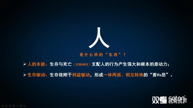 從上圖中大家可以看到,無論人性之善還是人性之惡,其實都包含“利己驅(qū)動”。“利己”是人在長期的自然環(huán)境中為了獲得生存不得不獲得更多外部資源的內(nèi)在驅(qū)動力,從而導(dǎo)致人總是會從利己的角度去考慮如何更快、更多的獲得。所以“人性本私”是無可非議的。