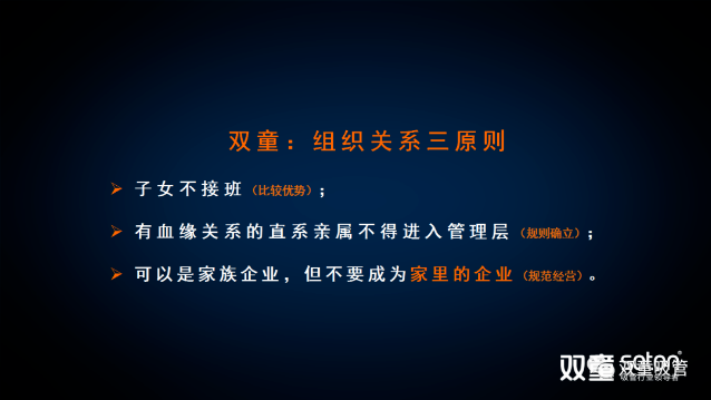 雙童在組織變革后明確形成了“組織關(guān)系三原則”,很多人不理解樓老師在十年前做出的“子女不接班”這樣的傳承安排,樓老師引導(dǎo)大家在傳承問題上沒有絕對的答案,雙童不讓子女接班并非我大公無私,而是運(yùn)用經(jīng)濟(jì)學(xué)的“比較優(yōu)勢”原理充分酌量后選擇的結(jié)果,是綜合考慮了子女的喜好、擅長、愿景后而得出的合理安排。當(dāng)然期間隱含的信號卻發(fā)出了巨大的想象空間。大家想想,在一家經(jīng)營了近二十年的傳統(tǒng)制造企業(yè)里面: