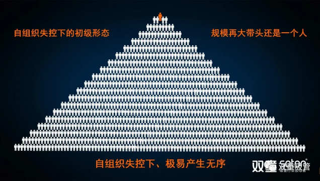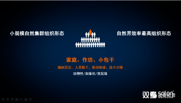 樓老師通過蟻群、猴群、魚群等自然界案例和思維邏輯圖,向大家展現(xiàn)了自然界當(dāng)中普遍存在的自然組織形態(tài)。這種基于動物性、血緣化本能而形成的雙層結(jié)構(gòu)的組織形式由于其編制靈活、人員精干、機(jī)動快速而戰(zhàn)斗力強(qiáng),是自然界當(dāng)中存在億萬年之久的十分高效的組織形態(tài)。