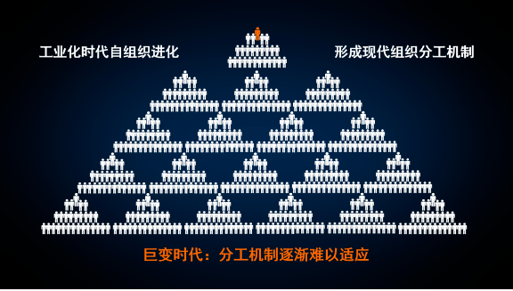 樓老師意識到巨變環(huán)境下只有改變自己和組織形態(tài)才能應(yīng)對上述不確定帶來的沖突,堅定地打破“組織的經(jīng)營慣性,推動組織進(jìn)行結(jié)構(gòu)性變革:推動雙童回歸自組織”。