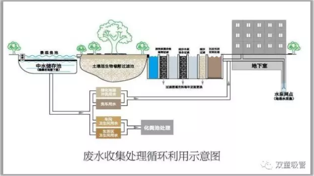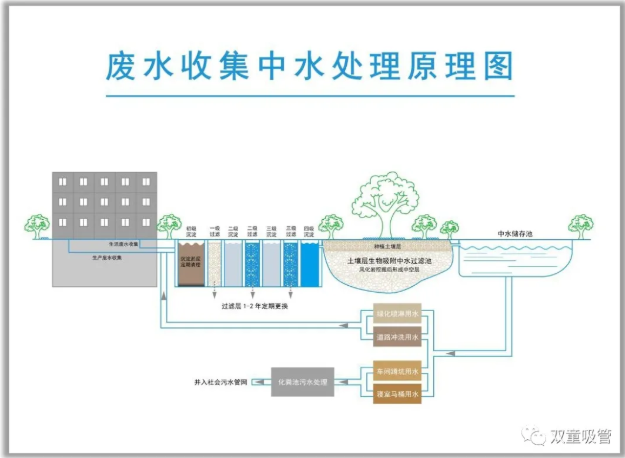 經過處理的水可以達到了三類水的標準,不能直接飲用和觸碰皮膚,但可以用于廠區(qū)綠化噴淋、所有洗手間抽水馬桶沖洗用水和道路清洗。這讓員工日常生活中所產生的廢水不僅得到循環(huán)利用,而且還消滅了企業(yè)的廢水排放和污染,同時一年還能為企業(yè)節(jié)省了三百多萬的費用,讓600人的工廠不用一噸自來水! “雙童”一期廠區(qū):廢水收集處理循環(huán)利用示意圖