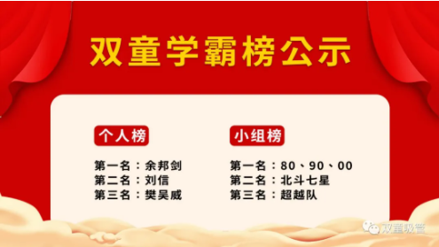 在經(jīng)歷了兩個多月的學(xué)習(xí)后,雙童的小伙伴們都收獲滿滿!我們的學(xué)霸也隨之誕生了!大家快來看看榜上有沒有自己呢?
