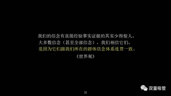 大多數(shù)人的誤區(qū)之一就是把群體間的共識當(dāng)成真理。在日常生活中,從眾效應(yīng)會使得我們在團隊當(dāng)中,很難保持獨立判斷;即使團隊信念出錯,我們也幾乎無法看出團隊在犯錯;即便我們能夠看出團隊信念的錯誤,一個人的反對意見在洪流中往往也顯得十分微不足道。有時候正是從眾效應(yīng),把企業(yè)、創(chuàng)新者、個人的思想牢牢地禁錮住了。