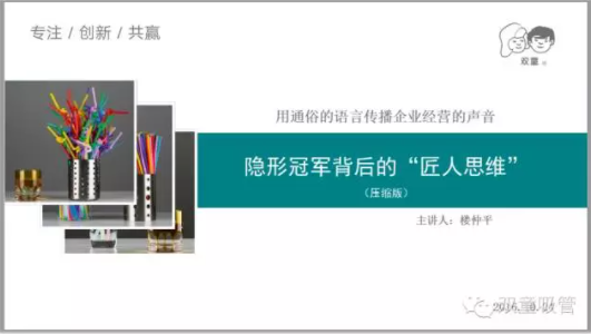 公司二樓,樓仲平正在打造的“吸管博物館”裝修已經(jīng)接近尾聲。他希望能通過這個(gè)窗口,不僅展示吸管的歷史與動(dòng)態(tài),更多的是讓工匠精神傳承下去,成就百年企業(yè)。 “如今中國(guó)的制造業(yè)不缺規(guī)模,缺的正是精益求精的品質(zhì)?!痹跇侵倨娇磥?,做企業(yè)是一個(gè)鏈?zhǔn)桨l(fā)展過程的持續(xù)積累,需要看得長(zhǎng)遠(yuǎn),需要從長(zhǎng)計(jì)議,需要耐得住寂寞,需要持續(xù)堅(jiān)守和專注,更需要扎根于內(nèi)心的“匠人之心”。就像他手中這一根吸管,雖然微不足道,但只要挖空心思去做。不去盲目和別人攀比,而是專注于把一件事做到極致,也會(huì)有很大的發(fā)展空間。 “做企業(yè)要有一顆‘平常心’,要簡(jiǎn)單,有時(shí)候甚至要‘一根筋’,企業(yè)家真正把自己精力和心思的90%花在內(nèi)部經(jīng)營(yíng)和企業(yè)管理上,企業(yè)就自然而然會(huì)好起來?!睒侵倨秸f,只有真正把企業(yè)做好了,所謂的名也好、利也罷,那是自然而然的事情,而所有這些特質(zhì)的東西,實(shí)際上就是我們要認(rèn)知的“匠人之心”,也就是現(xiàn)在社會(huì)極力在倡導(dǎo)的“工匠精神”。 樓仲平講課PPT截圖