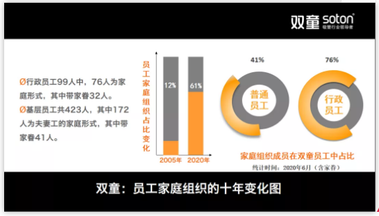 2004年9月開始,雙童就明確把中國(guó)傳統(tǒng)“家文化”作為員工管理的著力點(diǎn),鼓勵(lì)員工內(nèi)部戀愛,以“小家”形成“大家”。