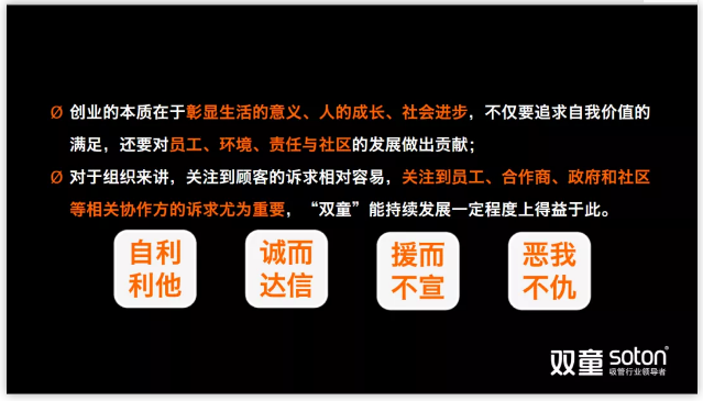當(dāng)說起“雙童”為何要持續(xù)堅(jiān)持“利他經(jīng)營(yíng)”時(shí),樓仲平答:“雙童”善待員工、善待生態(tài)、善待環(huán)境、善待他人,不是因?yàn)橛绣X了才良心發(fā)現(xiàn)才道德回饋,而是懂得“利他而利己”的邏輯關(guān)系,實(shí)際是:唯有持續(xù)對(duì)員工好,企業(yè)才會(huì)持續(xù)發(fā)展!