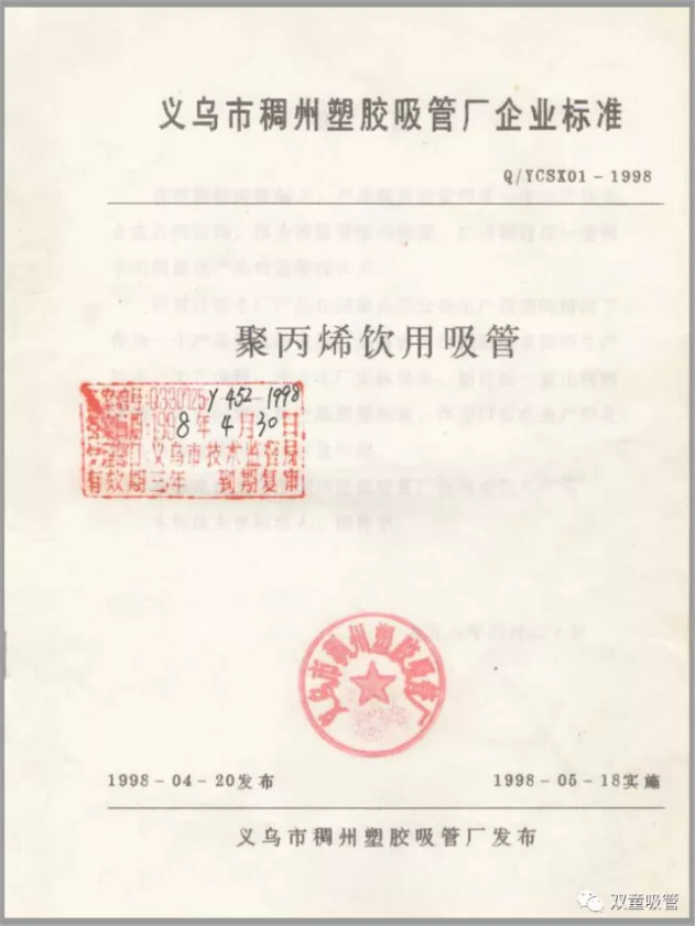 終于在1997年10月,由“雙童”前身的義烏市稠州塑膠吸管廠起草的《聚丙烯飲用吸管》企業(yè)標(biāo)準(zhǔn)順利通過審核,于1998年4月正式發(fā)布,成為當(dāng)時中國吸管行業(yè)最早的產(chǎn)品標(biāo)準(zhǔn)。從此,“雙童”打開了產(chǎn)品在商超場所的銷售渠道,實現(xiàn)了傳統(tǒng)家庭作坊企業(yè)向正規(guī)工廠的轉(zhuǎn)型。