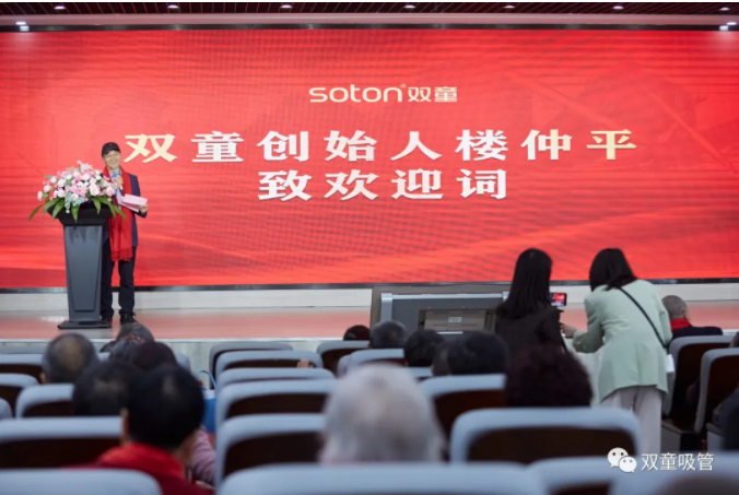 參觀完廠區(qū),家人們一起來(lái)到大會(huì)堂,樓仲平為大家致歡迎詞。他深情地對(duì)村里的長(zhǎng)輩家人表示感謝: