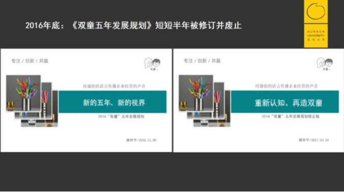 但2015年以后,在持續(xù)增長受限的現(xiàn)實(shí)情況下,我們逐漸意識到原來的“經(jīng)驗(yàn)”已經(jīng)逐漸失效,原本所謂的“成功模式”已經(jīng)不適用于“雙童”未來發(fā)展訴求。面對時(shí)代的不確定性,雙童第四個《五年發(fā)展規(guī)劃》短短半年被修訂并廢止,并明確后續(xù)不再推行《五年發(fā)展規(guī)劃》。