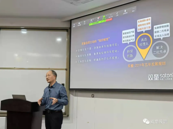 由于不同的講課形式,樓仲平也提前進(jìn)行了課程設(shè)計(jì),根據(jù)學(xué)生情況對課件內(nèi)容進(jìn)行了一些補(bǔ)充。經(jīng)過精心的準(zhǔn)備,樓仲平在課上把自己幾十年的創(chuàng)業(yè)經(jīng)驗(yàn)進(jìn)行總結(jié)分享,并將“雙童”組織發(fā)展的實(shí)踐認(rèn)知進(jìn)行分析,與同學(xué)們親切地交流。