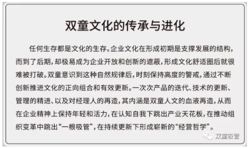 企業(yè)文化是在長(zhǎng)期的經(jīng)營(yíng)活動(dòng)中形成的,是對(duì)企業(yè)成長(zhǎng)環(huán)境、能力、經(jīng)驗(yàn)的歸納與變革,伴隨著企業(yè)的歷史而生。那么“雙童”的企業(yè)文化是如何傳承和進(jìn)化的呢?