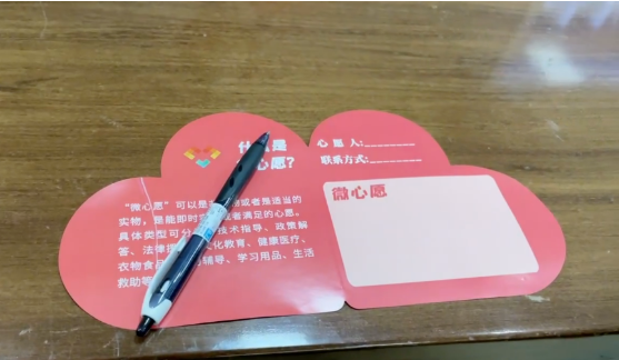 活動(dòng)現(xiàn)場(chǎng),“紅馬甲”們還遞上了一張?zhí)厥獾目ㄆ脑缚?,無(wú)論是工作上還是生活里的小愿望都可以被寫(xiě)在上面。