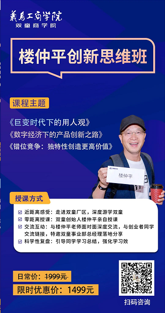 2021年,“義烏工商學(xué)院-雙童商學(xué)院”正式成立,打造義烏創(chuàng)業(yè)者“家門口的商學(xué)院”。“雙童”創(chuàng)始人樓仲平將40多年的創(chuàng)業(yè)實(shí)踐經(jīng)驗(yàn)和30多年的商業(yè)理論相結(jié)合,將曾在北大、浙大等大學(xué)分享的MBA商業(yè)實(shí)戰(zhàn)課程帶回義烏,聚焦本土中小創(chuàng)業(yè)者發(fā)展痛點(diǎn),打造 樓仲平創(chuàng)新思維班 ,并獲得了三千多名學(xué)員的一致好評(píng)!