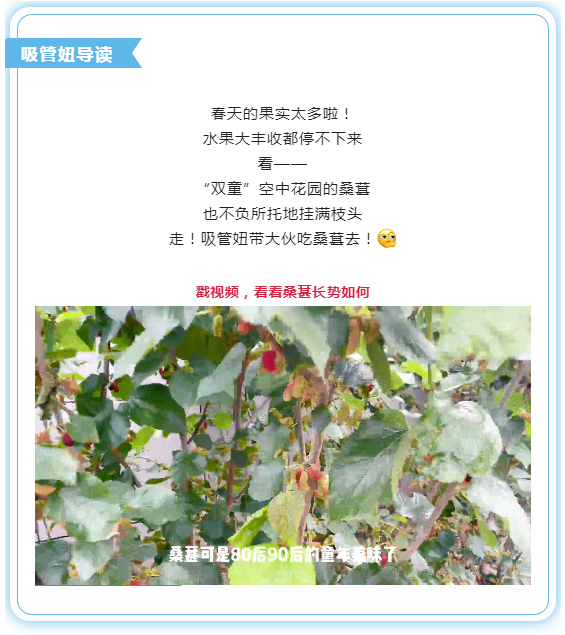 吸管妞已經(jīng)將吃桑葚的做法和注意事項(xiàng)全盤交代了。除了桑葚之外,在“雙童”還有各種櫻桃樹、柿子樹、石榴樹...…四季豐收,一年到頭都有最新鮮的水果吃!親愛的粉絲們,這樣的工作環(huán)境你羨慕嗎?