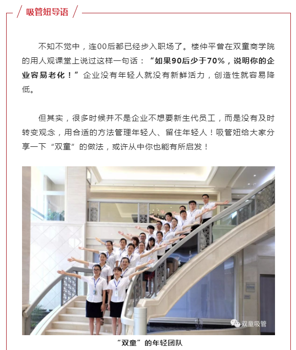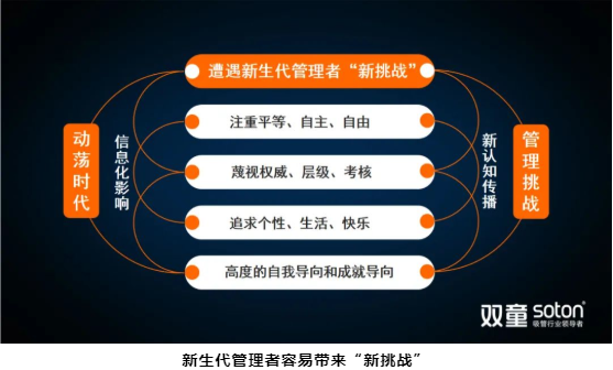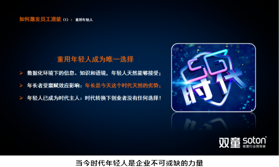新生代員工的成長環(huán)境塑造了他們的性格,認(rèn)知方式也會不同于其他時代的人。一旦老板與員工的認(rèn)知不同,那就很難達成思想同頻,自然會有沖突。這些沖突正是“年輕人不好管”這種觀念產(chǎn)生的源頭。“雙童”用這個方式解答這一沖突:用年輕人去管理年輕人,敢于授權(quán)給年輕人,運用新生代的力量突破巨變時代下企業(yè)發(fā)展的局限。
