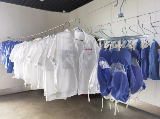 首先,是清洗場所?!半p童”的工服洗衣房就和車間清洗間配置在一起,既聯(lián)通車間,提高工服來回運送的效率,又能夠保持相對獨立,不影響生產(chǎn)。這里的洗衣工具齊全,既有機洗區(qū)域,也有供斷電情況使用的手洗池。