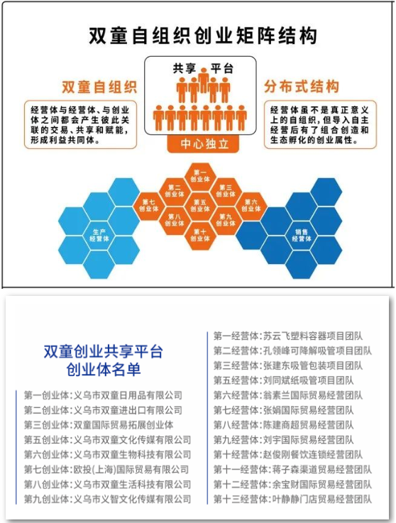 通過(guò)近五年的自組織裂變,雙童成立了八大創(chuàng)業(yè)體及十二個(gè)經(jīng)營(yíng)體,形成了自裂變、自生長(zhǎng)的創(chuàng)業(yè)生態(tài)。