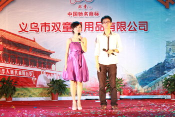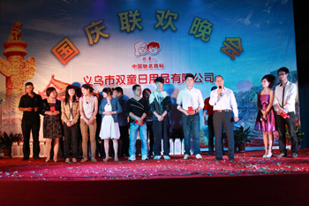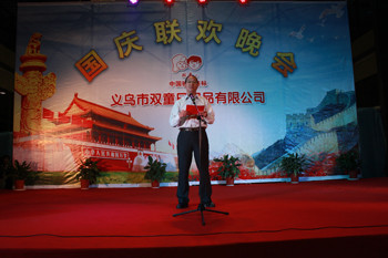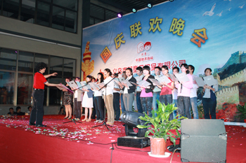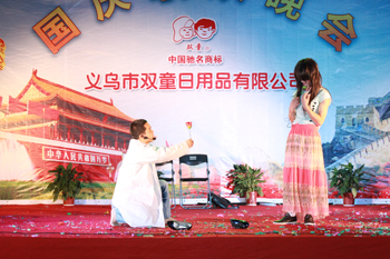 為迎接祖國62周年華誕,9月30日晚,雙童公司廠區(qū)里燈火輝煌、人頭攢動,歌聲嘹亮。公司在廠區(qū)隆重舉辦“歡騰國慶、雙童之夜”文藝聯(lián)歡晚會。公司董事長樓仲平、廠長、副總經(jīng)理等多位領(lǐng)導(dǎo)同雙童公司500余名職工及家屬一起觀看演出,共慶國慶。