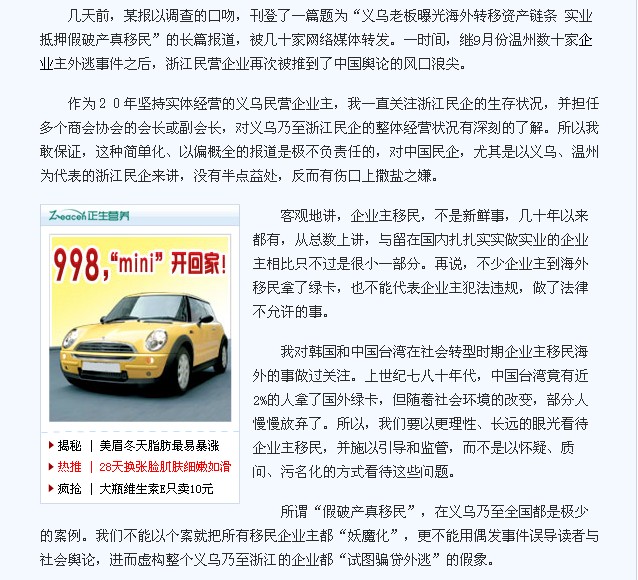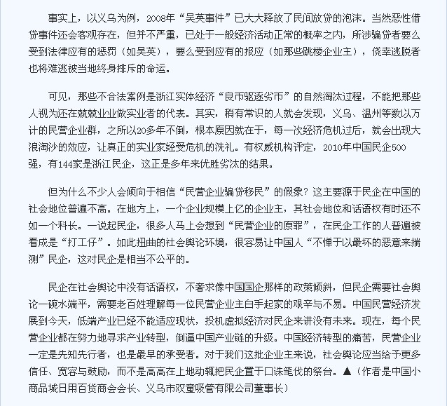 幾天前,某報(bào)以調(diào)查的口吻,刊登了一篇題為“義烏老板曝光海外轉(zhuǎn)移資產(chǎn)鏈條 實(shí)業(yè)抵押假破產(chǎn)真移民”的長(zhǎng)篇報(bào)道,被幾十家網(wǎng)絡(luò)媒體轉(zhuǎn)發(fā)。一時(shí)間,繼9月份溫州數(shù)十家企業(yè)主外逃事件之后,浙江民營(yíng)企業(yè)再次被推到了中國(guó)輿論的風(fēng)口浪尖。
