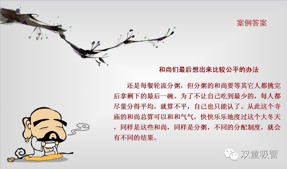 有一個山間寺廟住著一大班小和尚,因為大雪封山無法下山化緣施舍,老和尚也因為下山化緣而無法回到寺廟,每天兩餐都要靠山上村民施舍的一大桶粥過日子,要命的是人多粥少,每天都是不夠吃的。一開始他們抓鬮決定誰來分粥,每天由一個小和尚輪流分粥。于是乎每一圈下來他們只有一天是飽的,就是自己分粥的那一天;后來他們開始推選出一個道德高尚的和尚每天分粥,結(jié)果所有和尚開始挖空心思去討好他,賄賂他,一段時間后,搞得整個寺廟烏煙障氣;然后實在沒有辦法,大家又開始組成分粥委員會和監(jiān)督小組,結(jié)果也是互相攻擊、相互扯皮,每餐都要花很長的時間進行分粥,雖然對公平了,但吃到嘴里的粥全是冰冷冷的。