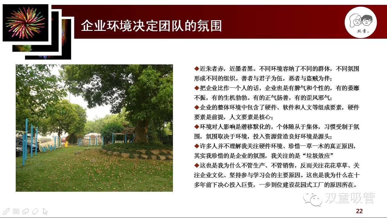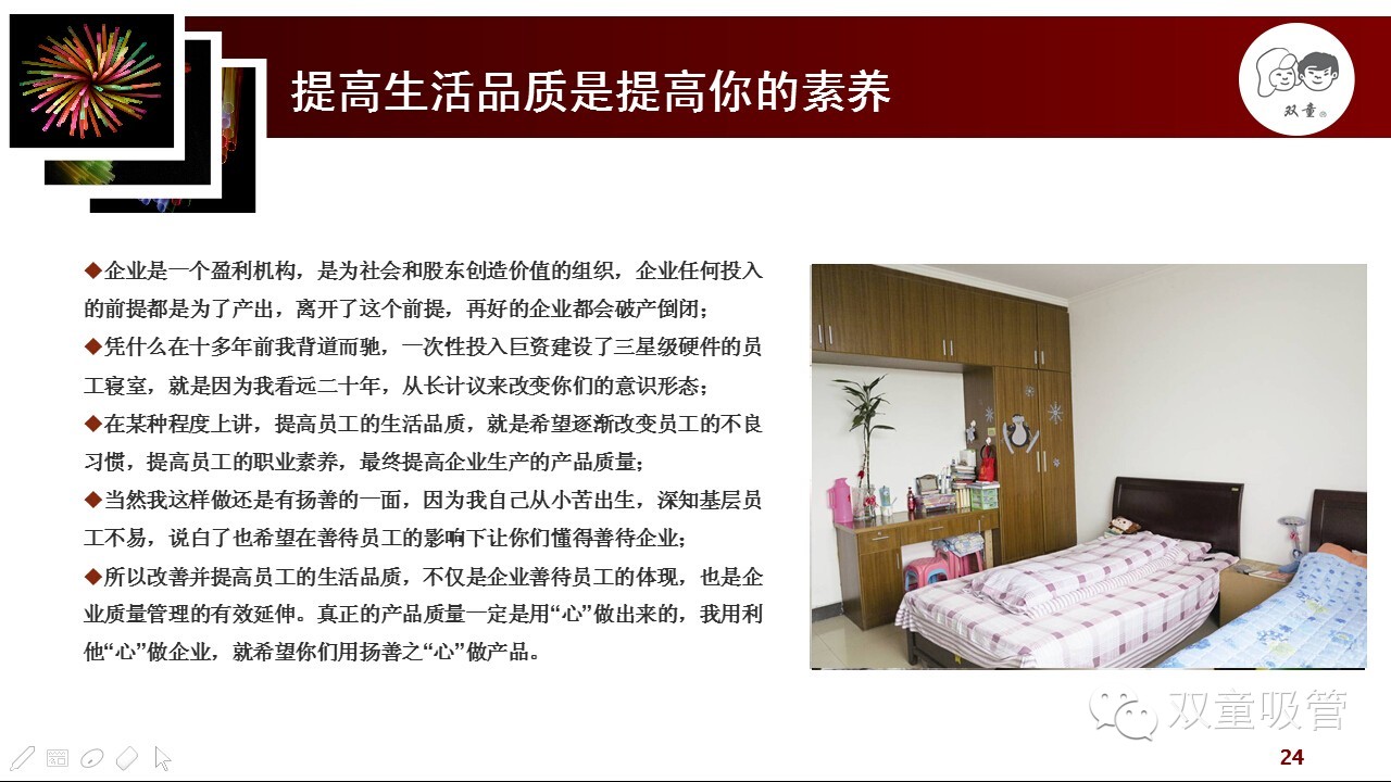 第二部分,董事長(zhǎng)延伸到了我們雙童吸管的企業(yè)文化,向員工們講起了他的創(chuàng)業(yè)經(jīng)歷和管理雙童以來(lái)發(fā)生的一些故事。他說(shuō),無(wú)論是現(xiàn)場(chǎng)管理還是質(zhì)量管理,說(shuō)白了都是“人心管理”,唯有把人“心”管住了,所有問(wèn)題才能逐項(xiàng)解決。當(dāng)然人“心”最難管,需要恒心,需要耐心,需要看的長(zhǎng)遠(yuǎn)做更多善待員工的利他之心。