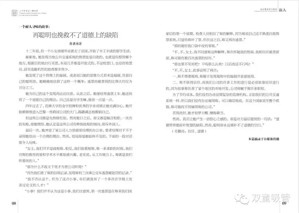 《社會(huì)案例學(xué)習(xí)教材》里包括了做人、做事、經(jīng)營文化、管理文化等各個(gè)主題的經(jīng)典好文,實(shí)際上也是按照雙童的企業(yè)文化要素進(jìn)行分類收錄,其中一大部分都是從吸管妞平時(shí)發(fā)給大家的微信文章里收集到的哦!
