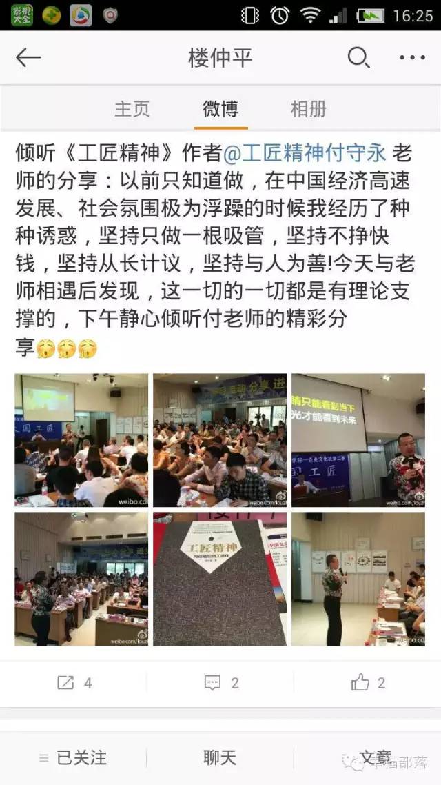 看,樓總在課程中在微博上分享:以前只知道做,在中國(guó)經(jīng)濟(jì)高速發(fā)展,社會(huì)氛圍極為浮躁的時(shí)候我經(jīng)歷了種種誘惑,堅(jiān)持只做一根吸管,堅(jiān)持不掙快錢、堅(jiān)持從長(zhǎng)計(jì)議、堅(jiān)持與人為善,今日與付老師相遇后才發(fā)現(xiàn),這一切都是有理論支撐的。盡心傾聽(tīng)付老師帶來(lái)《工匠精神》的精彩分享。
