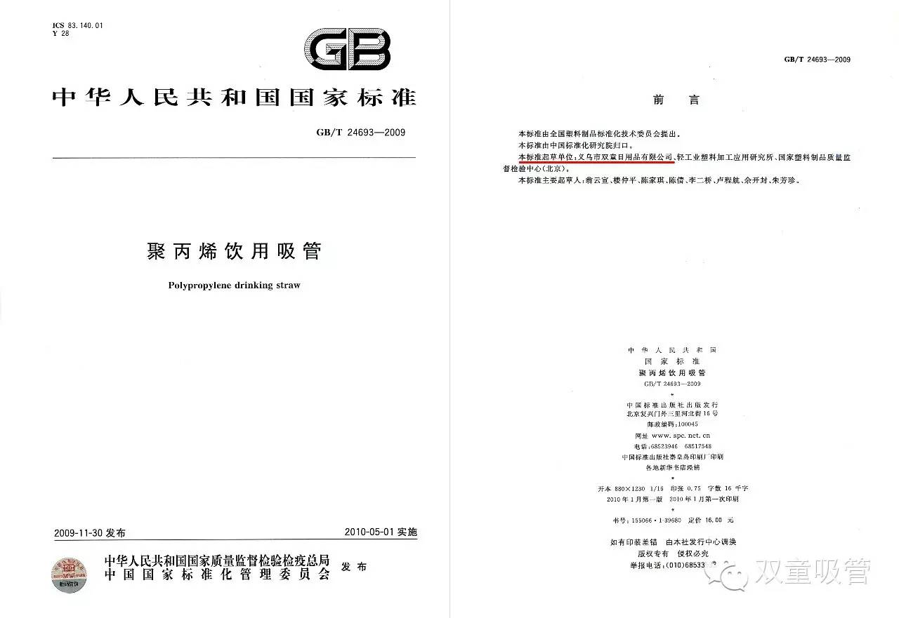 由雙童吸管起草發(fā)布的《聚丙烯飲用吸管》國家標(biāo)準文件